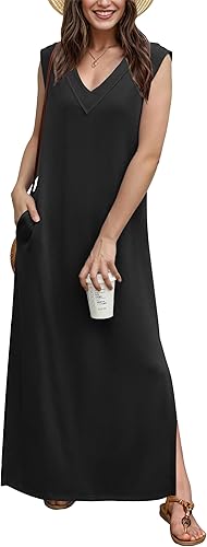 2024 Women Summer V-Neck Casual Loose Split Wrinkle-Free Long Maxi Beach Dress with Pockets