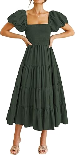 Women's Casual Summer Midi Dress Puffy Short Sleeve Square Neck Smocked Tiered Ruffle Dresses