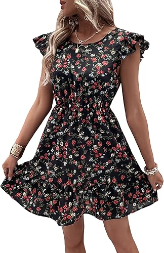 Women's Floral Print Ruffle Trim Cap Sleeve Tie Back A Line Mini Dress