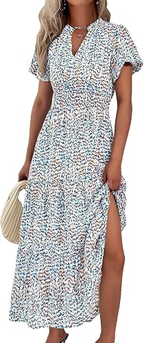 Summer Maxi Dress for Women 2024 Casual V Neck Puff Short Sleeve Smocked Ruffle Flowy Beach Boho Long Floral Dress