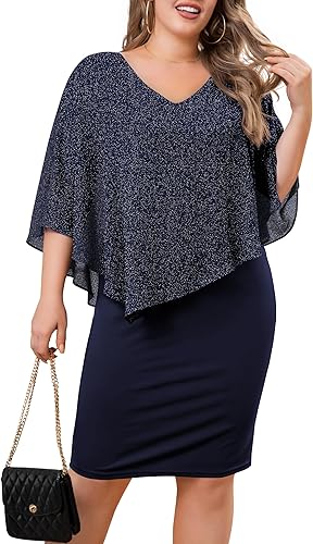 Women's Plus Size V Neck Bodycon Pencil Dresses Chiffon Cape Midi Dress L-4XL