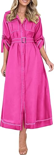 Women's Maxi Shirt Dress Casual 3/4 Sleeve Button Down Lapel V Neck A Line Belted Long Dresses