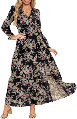 Women's Boho Maxi Dress Sexy V Neck Puff Long Sleeve Ruffle A-Line Split Swing Chiffon Dresses
