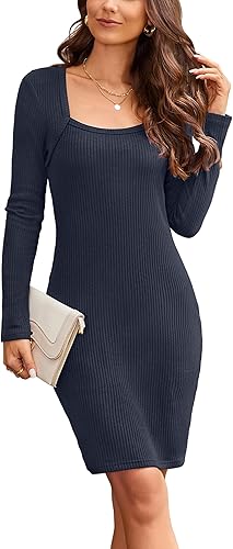 Womens 2024 Fall Dresses Long Sleeve Square Neck Rib Knit Winter Sweater Dress Bodycon Business Casual Outfits