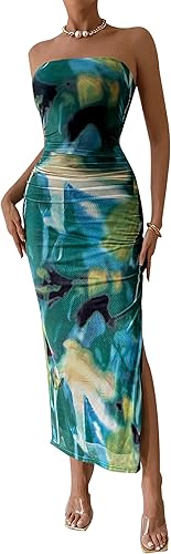 Women's Summer Maxi Bodycon Dresses Strapless Tube Top Printed Long Party Club Slit Dress